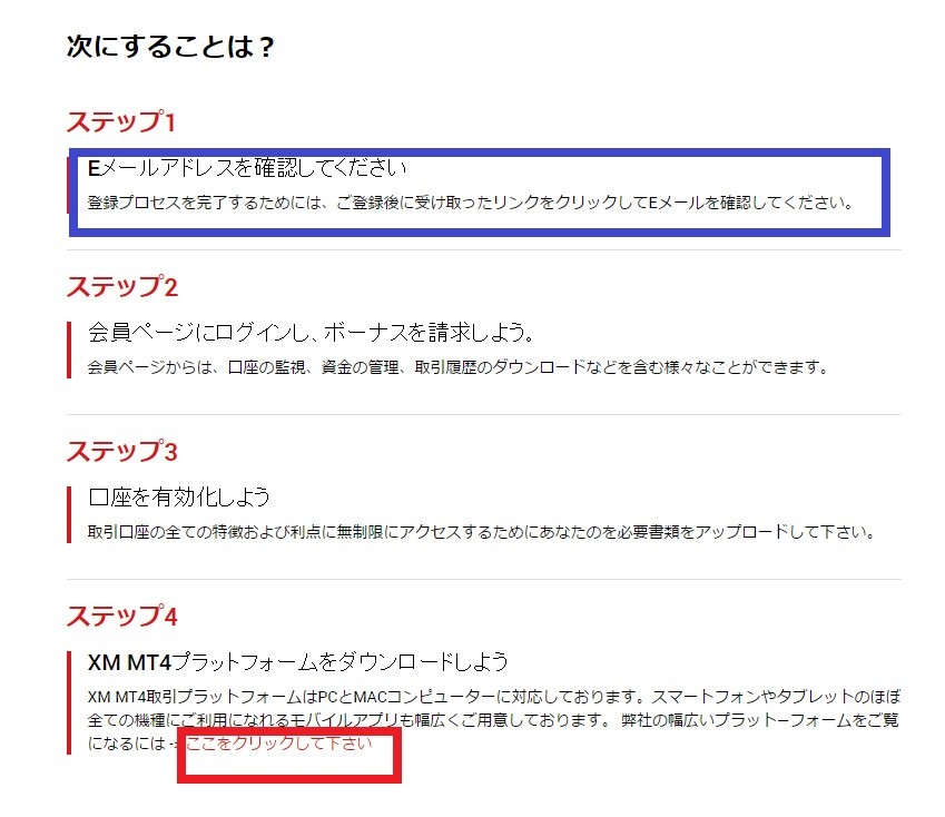 XMの公式サイトへいき、画像赤枠の「口座開設する」ボタンをクリックします。