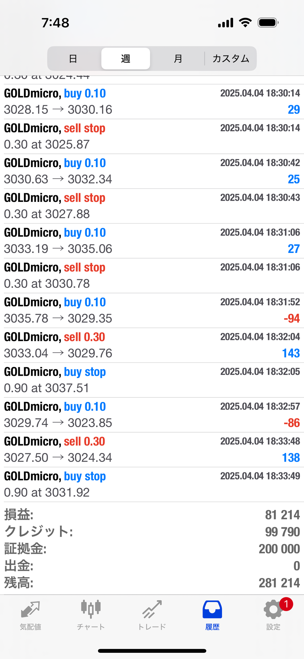 ちなみに週間結果は下のスクショの通りです。ほぼ1週間で8万の利益は上出来過ぎな状況。